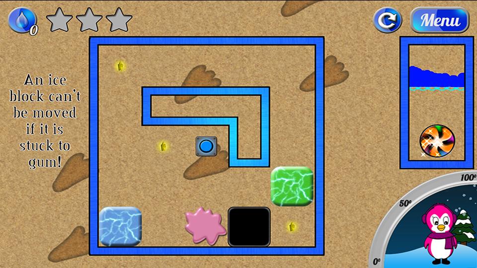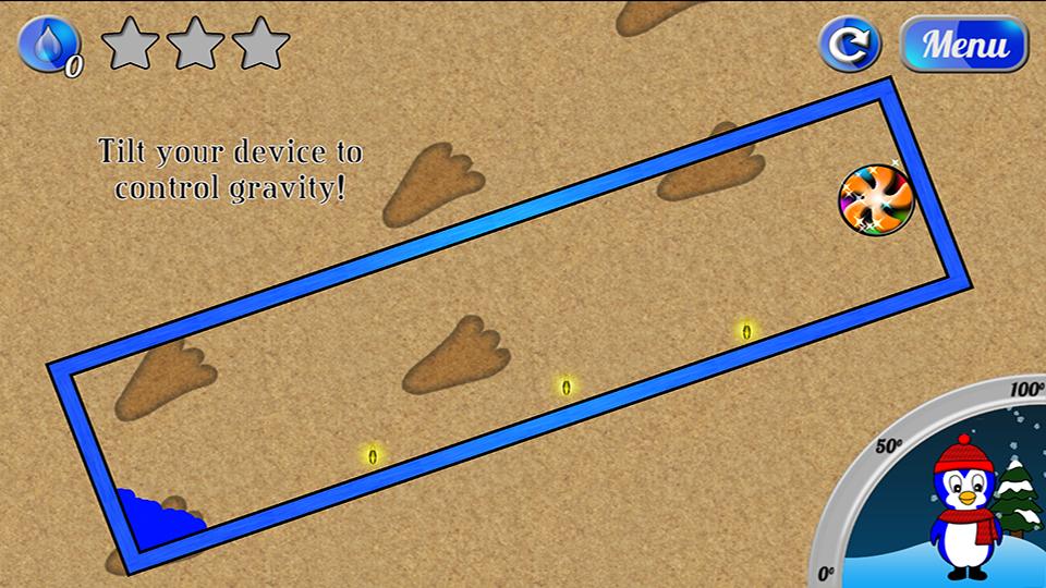 Мелти устал от холодной зимы. Помогите ему согреться, завершив сложные головоломки. Поверните свое устройство, чтобы перемещать воду вокруг экрана, чтобы собрать звезды и заполнить термометр.